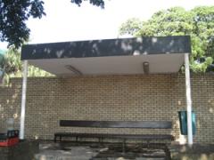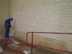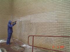 Paint being stripped, before removing underlying Graffiti from face brick.