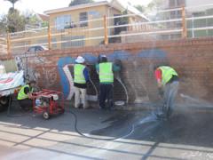 Graffiti Tags being removed from precast wall and face brick by G.R.S